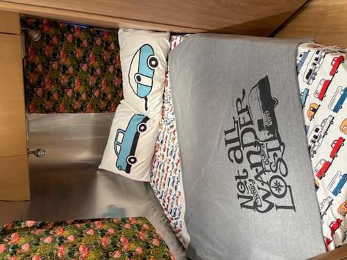 The rear bedroom offers a cozy retreat with a plush double bed beneath a skylight, inviting soft morning light or nighttime stargazing. Up front, the L-shaped sofa converts into a second sleeping area for two, offering flexibility for guests or family. All upholstery, blinds, and soft furnishings remain original and in excellent condition, reflecting the care of non-smoking, pet-free owners.